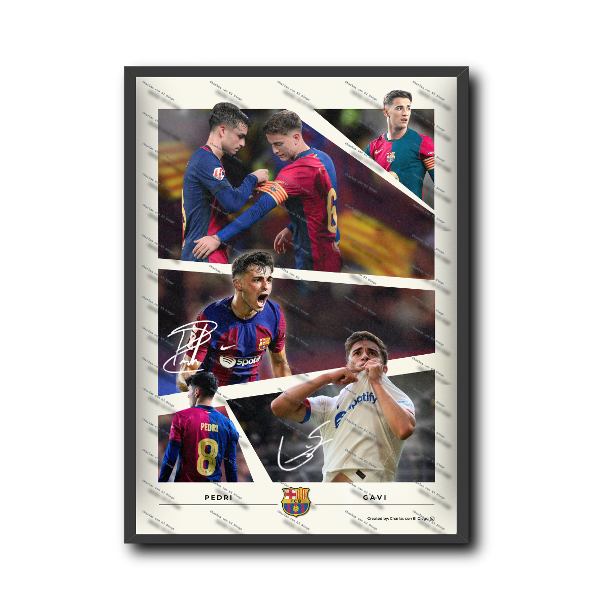 Este cuadro del Barcelona presenta un impactante collage de Pedri y Gavi, los jóvenes referentes que inspiran al equipo con su talento y energía. Ideal para los fans que reconocen el futuro brillante del club, esta obra captura la esencia y la pasión de dos pilares fundamentales. Decora tus espacios con la fuerza renovada del Barcelona y lleva contigo el espíritu de sus estrellas emergentes.