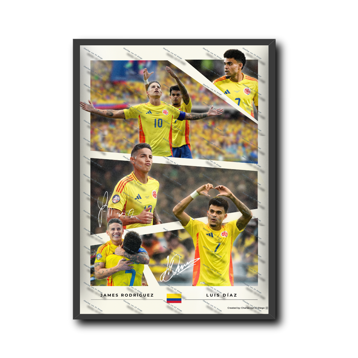 Este cuadro único celebra a dos estrellas del fútbol colombiano: James Rodríguez y Luis Díaz, ambos vistiendo la camiseta de la selección Colombia. Una pieza imprescindible para los aficionados que quieren expresar su orgullo nacional y admiración por estos destacados jugadores. Ideal para decorar cualquier espacio con un toque de pasión deportiva y homenaje al talento que representa a Colombia en el mundo.