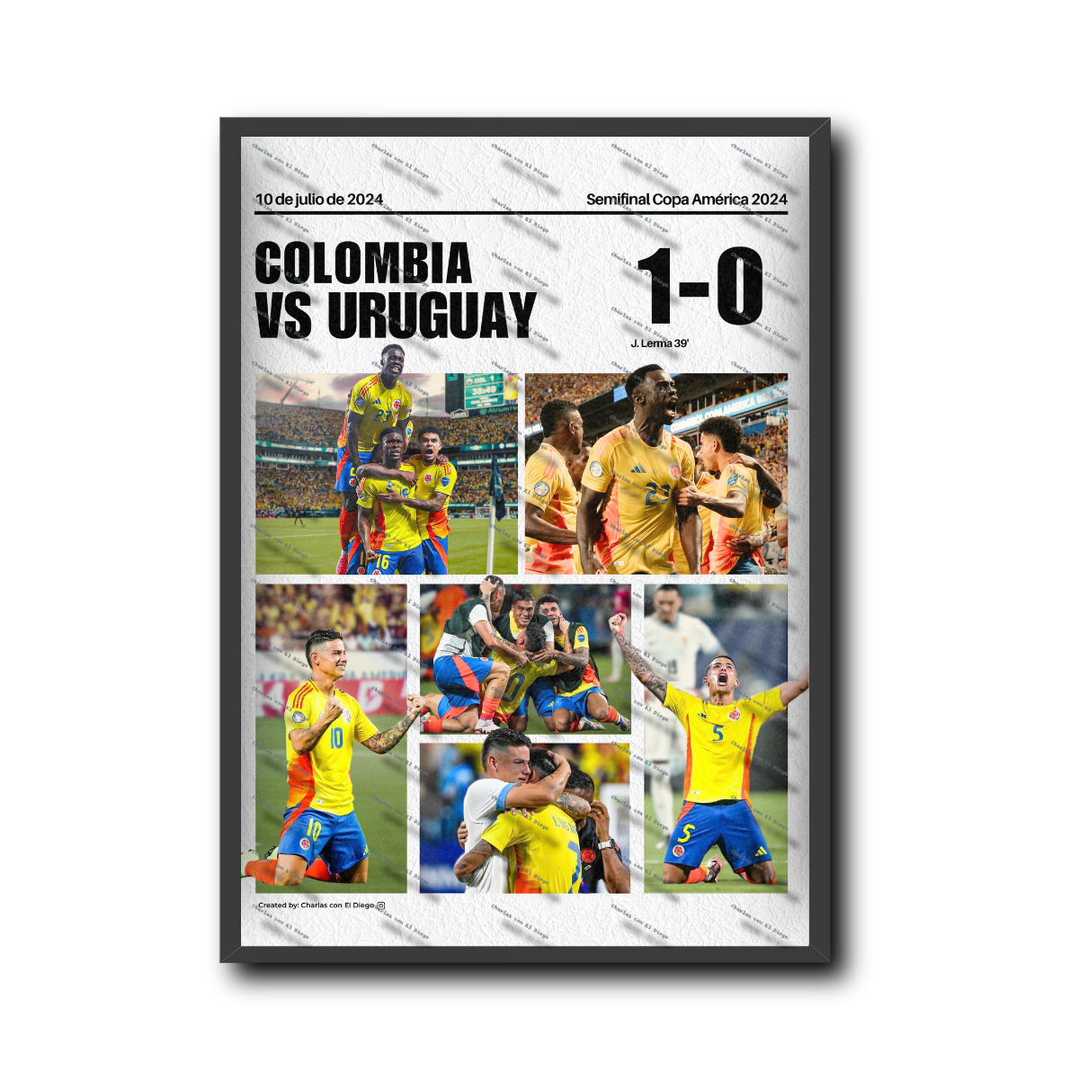 Este cuadro celebra la histórica victoria de Colombia sobre Uruguay 1-0 en la semifinal de la Copa América 2024, un triunfo que llevó al equipo nacional a la gran final. Ideal para los apasionados del fútbol colombiano, esta pieza captura la emoción y el orgullo de un momento decisivo, convirtiéndola en un homenaje perfecto para cualquier espacio dedicado al deporte y al patriotismo.