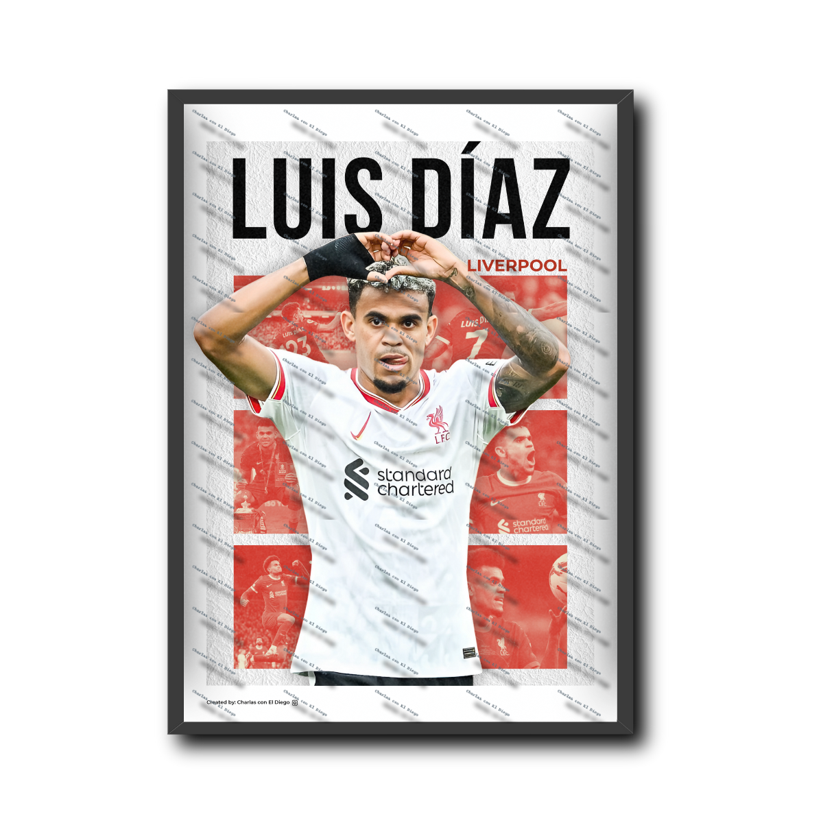 Este cuadro presenta a Luis Díaz luciendo con orgullo la camiseta del Liverpool, destacando su entrega y estilo dentro del equipo. Una pieza imprescindible para los seguidores que quieren reflejar su pasión por el jugador y el club. Ideal para decorar cualquier espacio con energía y orgullo futbolístico.
