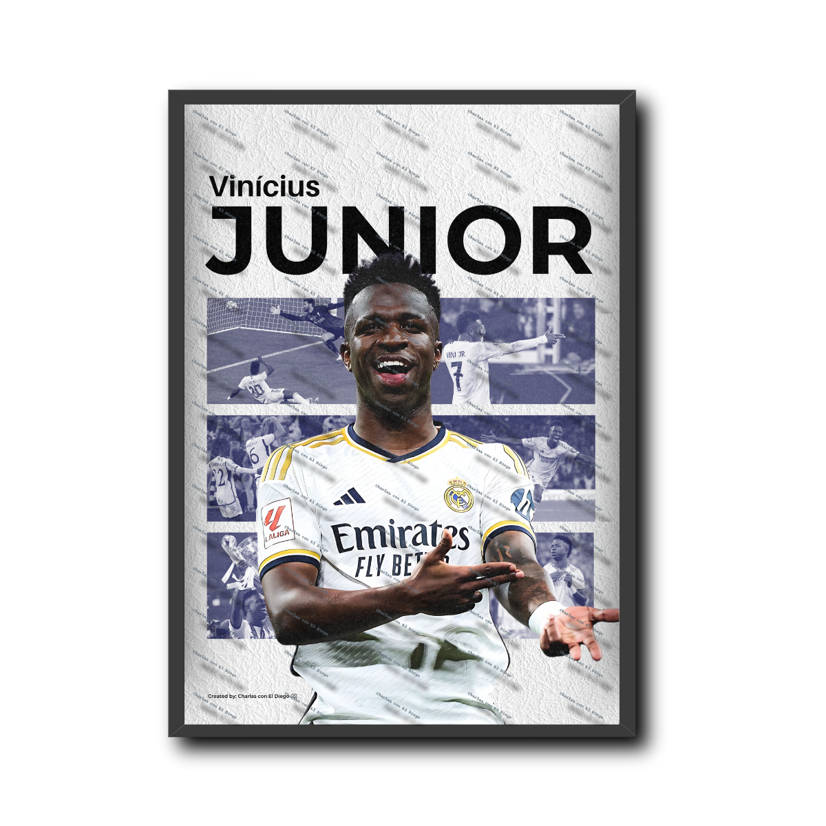 Celebra la magia de Vinícius Júnior con este impactante cuadro que lo muestra vistiendo la camiseta del Real Madrid. Ideal para fanáticos del fútbol y del club merengue, esta obra captura la energía y pasión del jugador en momentos clave. Perfecto para decorar cualquier espacio con estilo y personalidad, este cuadro inspira a seguir tus sueños con dedicación y talento. Lleva la emoción del Santiago Bernabéu a tu hogar con esta representación fiel y vibrante de una de las estrellas más brillantes del fútbol internacional.